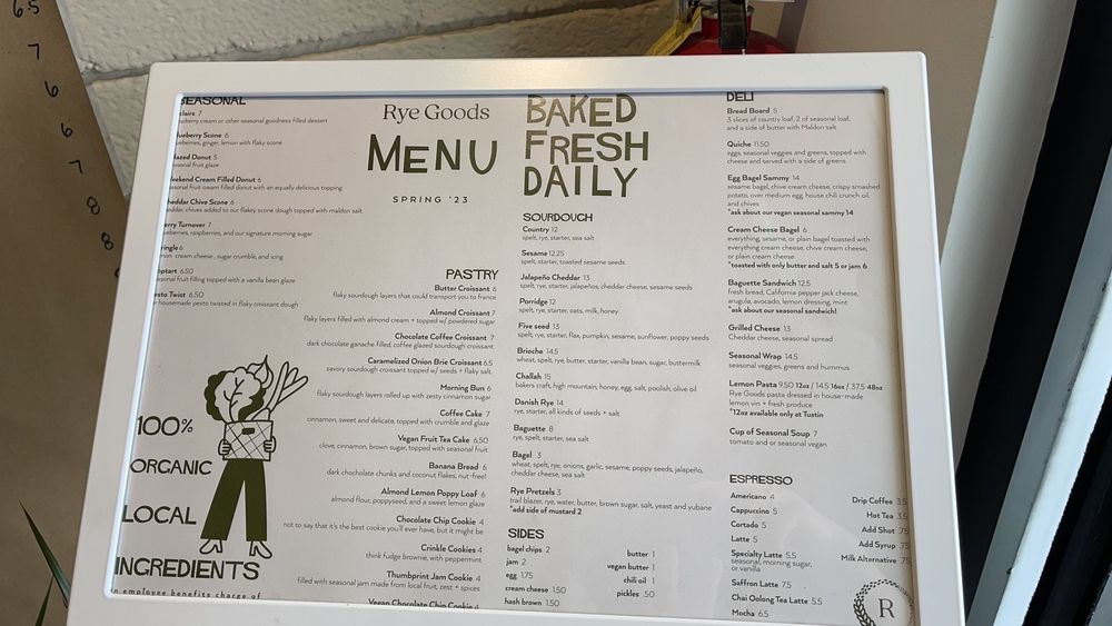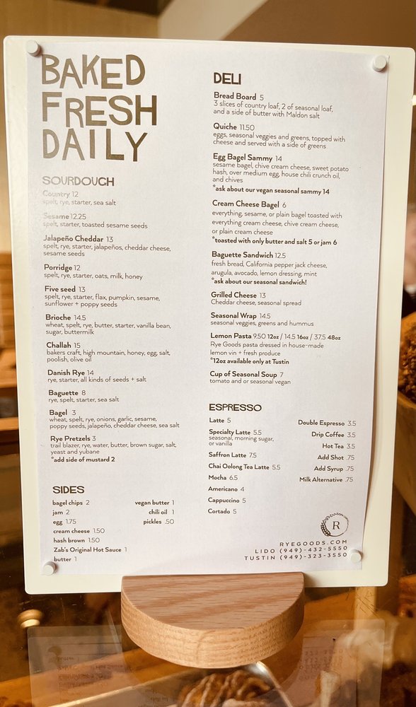 Introducing the Menu at Rye Goods presents a delightful journey into the world of artisanal baked goods right in the heart of Newport Beach. At Rye Goods, you’ll discover a menu that embraces the essence of boutique baking, featuring an array of pastries, sourdough breads, and breakfast plates, all crafted to perfection. The morning bun, praised for its delightful layers and balanced sweetness, is a must-try, alongside their flavorful bagel sandwiches.